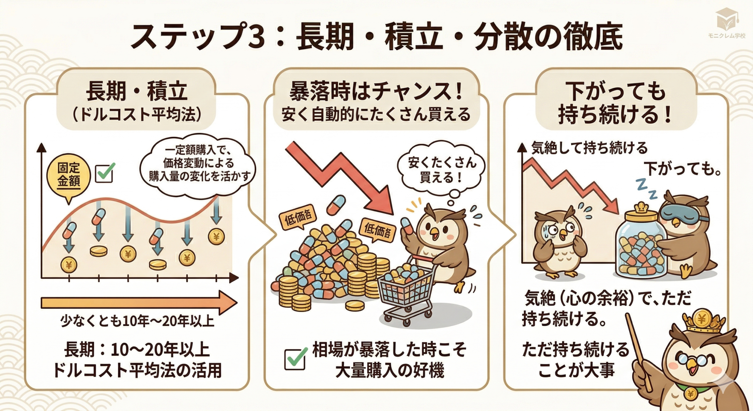 少なくとも10〜20年以上の継続を前提に、ドルコスト平均法を活用する。