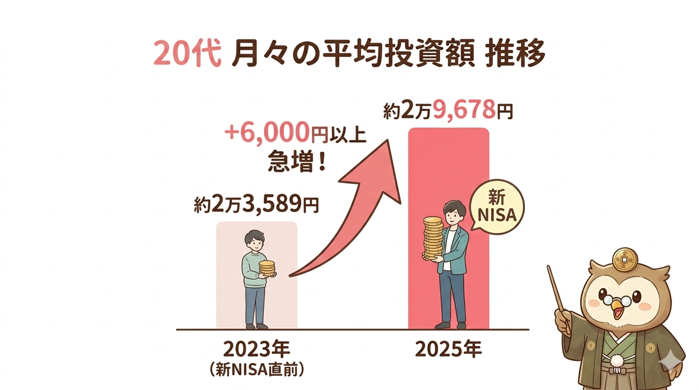 - 20代の月平均投資額:2023年の約2万3,589円 → 2025年には約2万9,678円へ急増⤴️