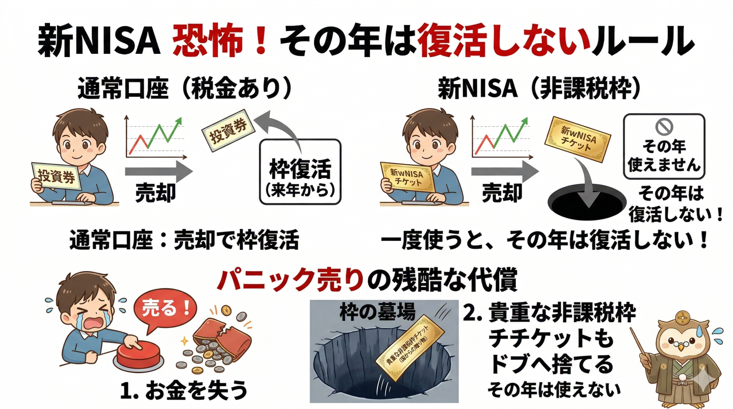 つまりパニック売りをすると、お金を失うだけでなく、貴重な非課税枠のチケットまでドブに捨てることになる。