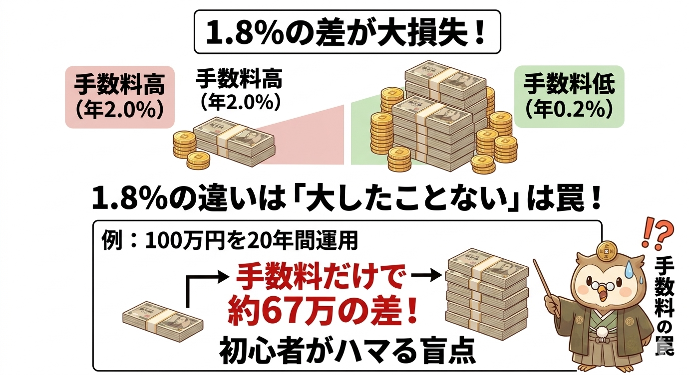 「1.8%の差なんて大したことない」と思いがちじゃが、100万円を20年間運用した場合、この差だけで約67万円もの損失が生じる。