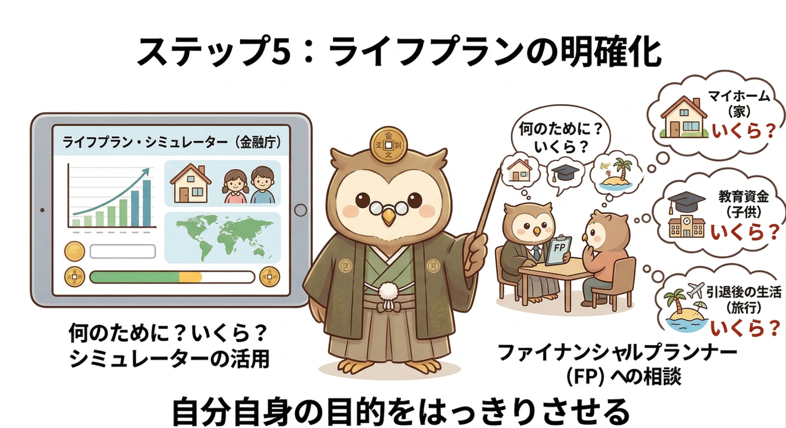 金融庁のシミュレーターやファイナンシャルプランナーを活用して、「何のためにいくら必要なのか」を自分自身ではっきりさせることじゃ。