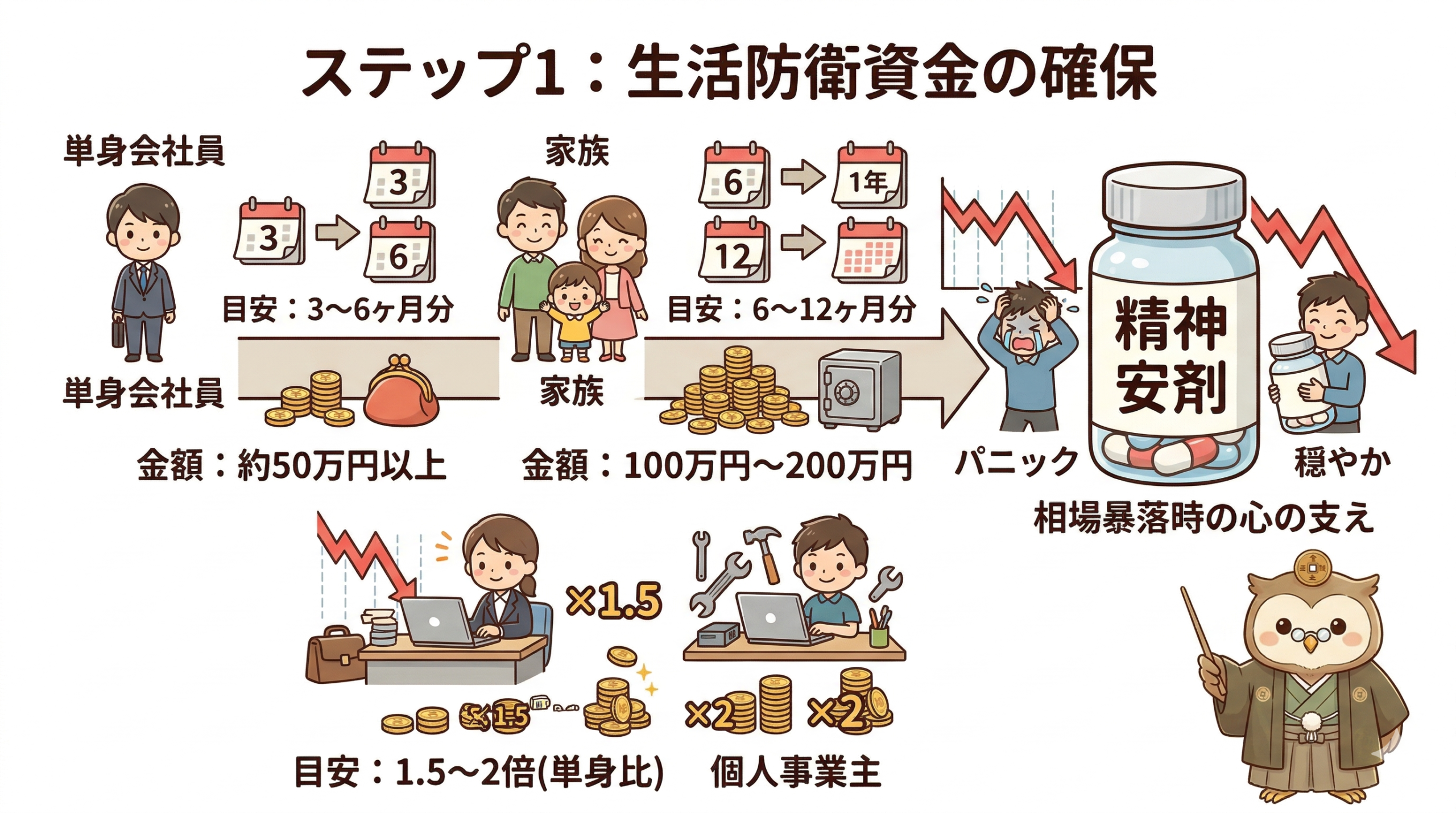 - 会社員・単身者:生活費の3〜6ヶ月分(目安50万円以上)