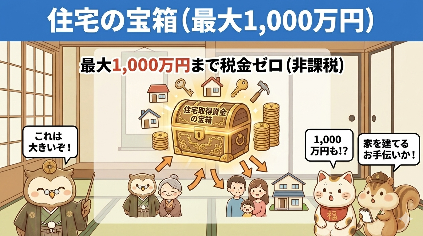 子供や孫が家を建てたり買ったりする際の資金援助なら、最大1,000万円まで非課税で渡せます。