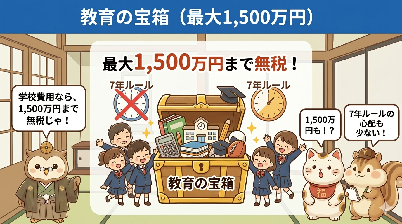 孫の学校費用のためなら、最大1,500万円まで非課税です。