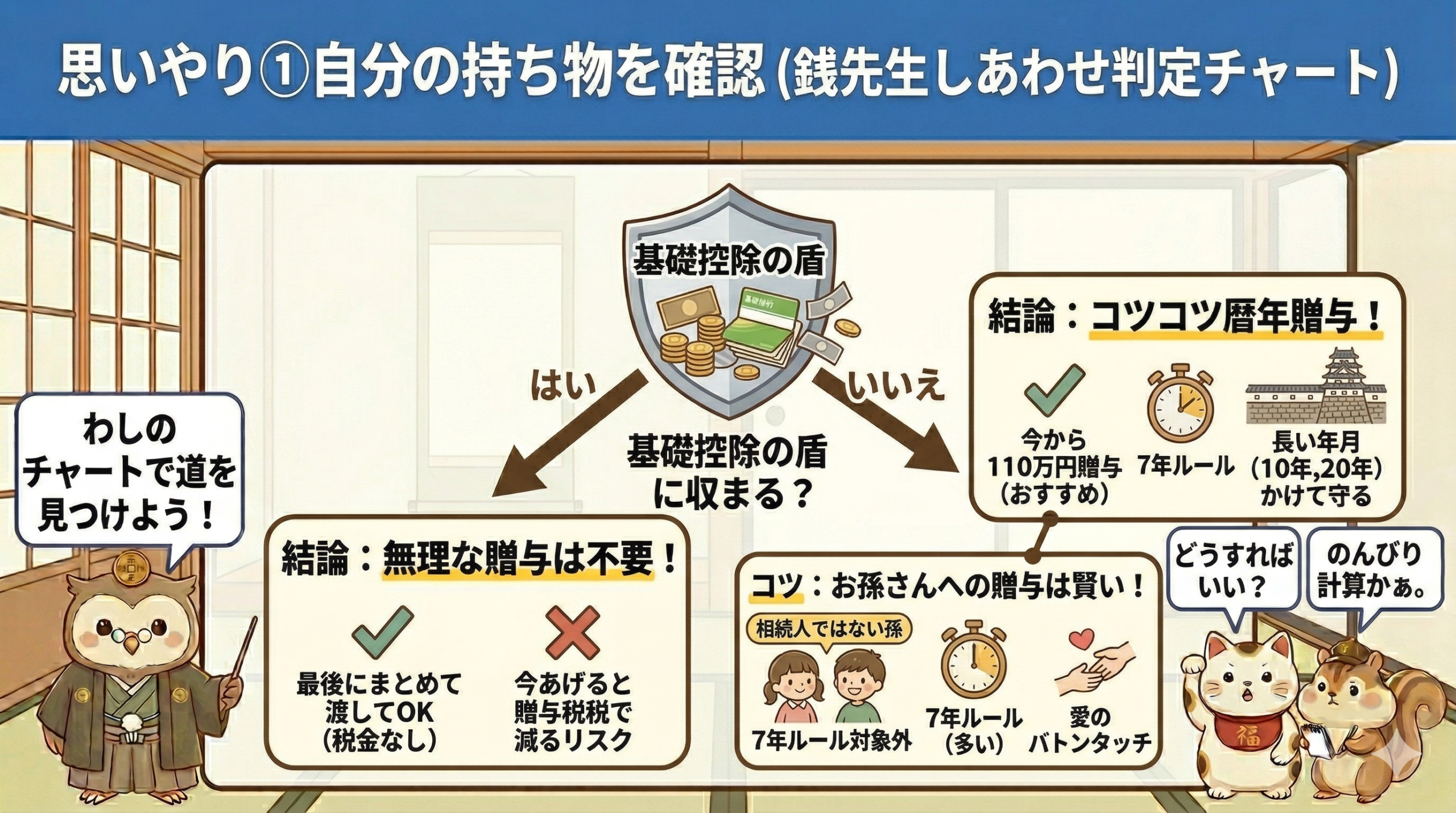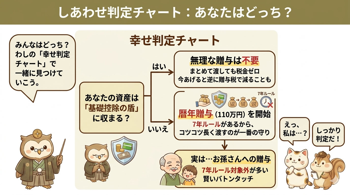また、法定相続人ではないお孫さんへの贈与は、この7年ルールの対象になることが多いため、愛するお孫さんに直接バトンタッチするのも賢い方法です。
