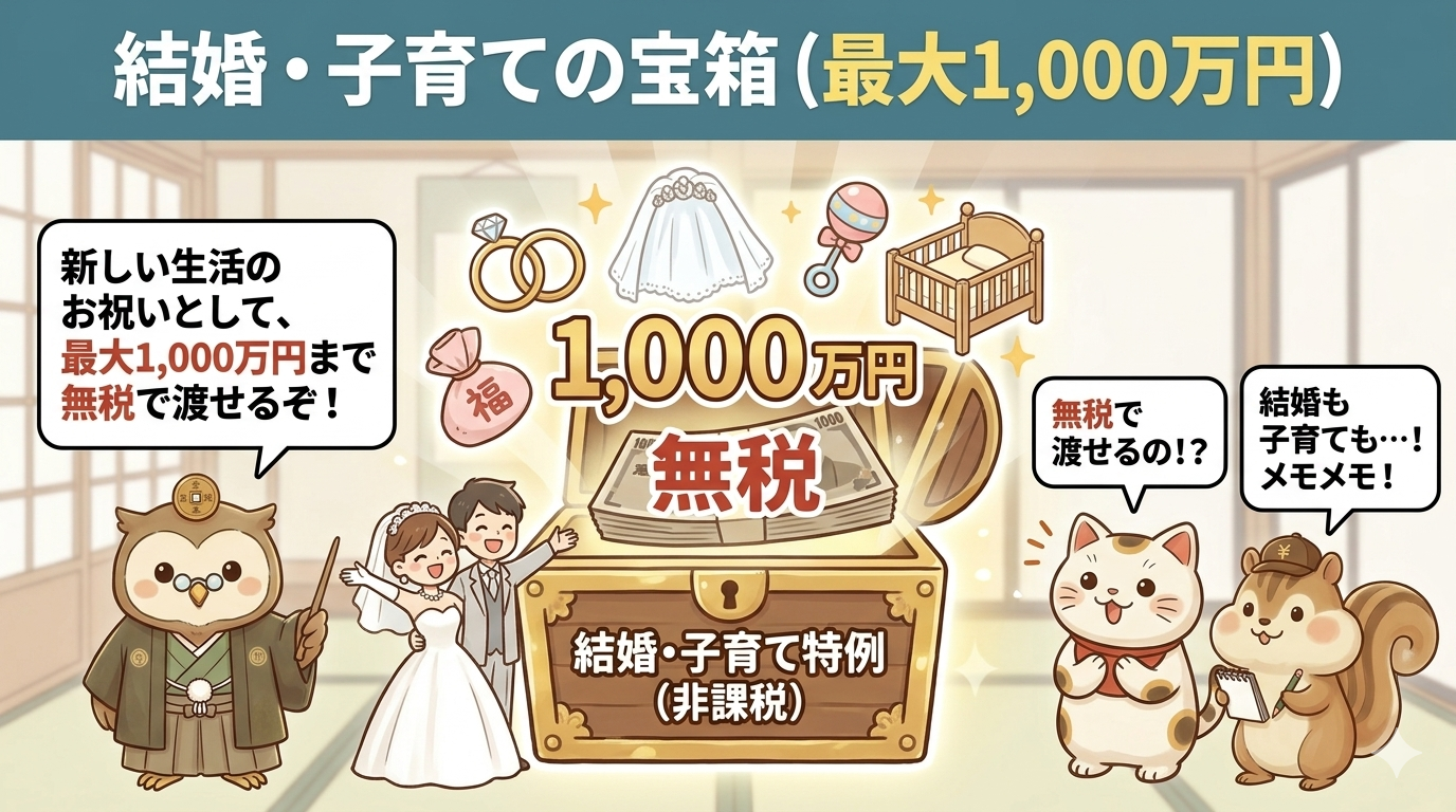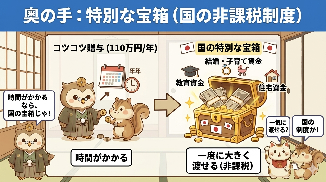 毎年110万円では時間がかかりすぎると感じる方には、一度に大きなお金を渡せる非課税制度があります。