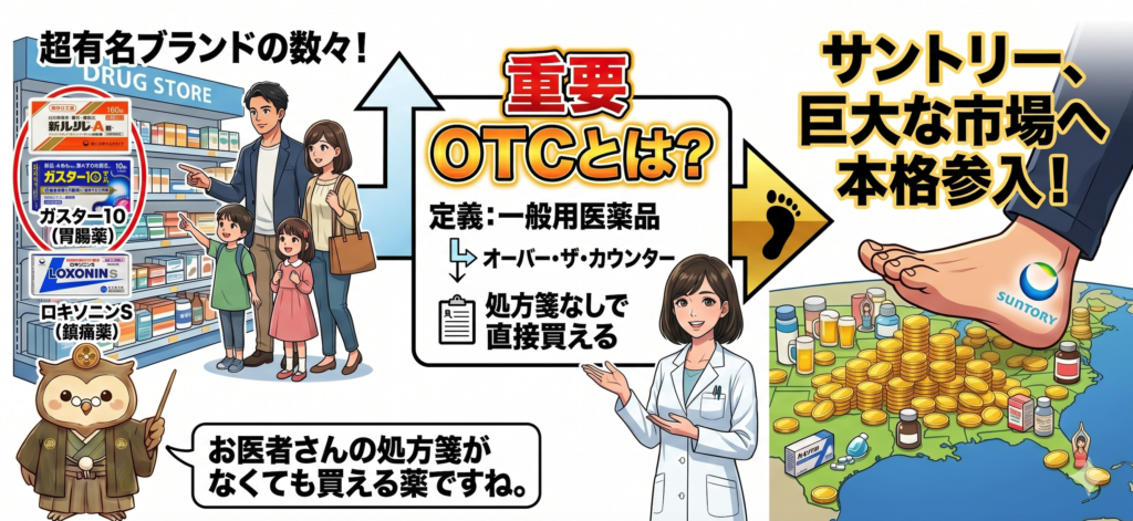 OTCとは医師の処方箋がなくても消費者が薬局で直接購入できる医薬品のことで、サントリーはこの巨大な市場に本格的に乗り込んでいくことになります。