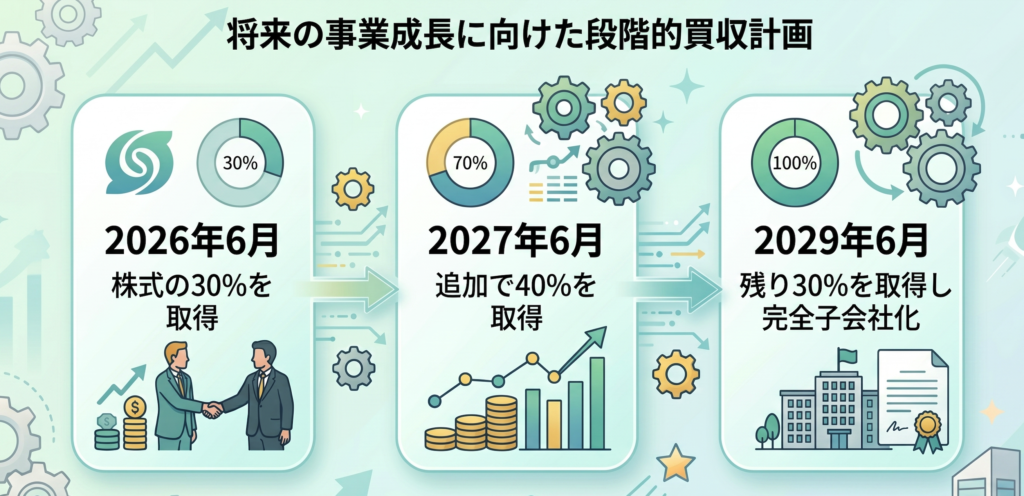 なお、この買収は一気に行われるのではなく、三段階の計画で進められる予定です。